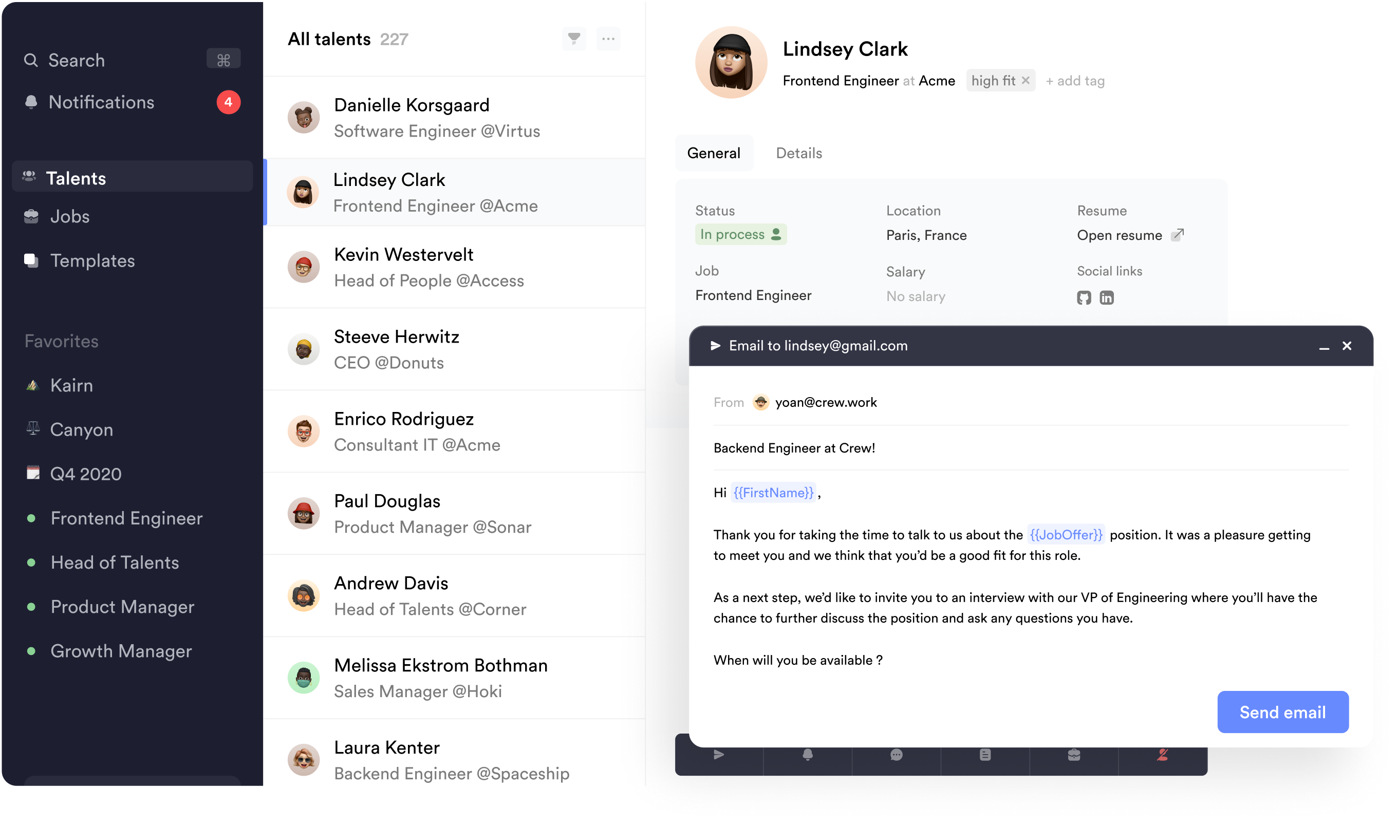 => C'est l'une des principales différences entre Crew et les autres outils (ATS), nous ne l'avons pas construit uniquement pour les responsables de l'acquisition de talents, mais pour toute l'équipe. Parce que le recrutement est maintenant un sport d'équipe ⚽️