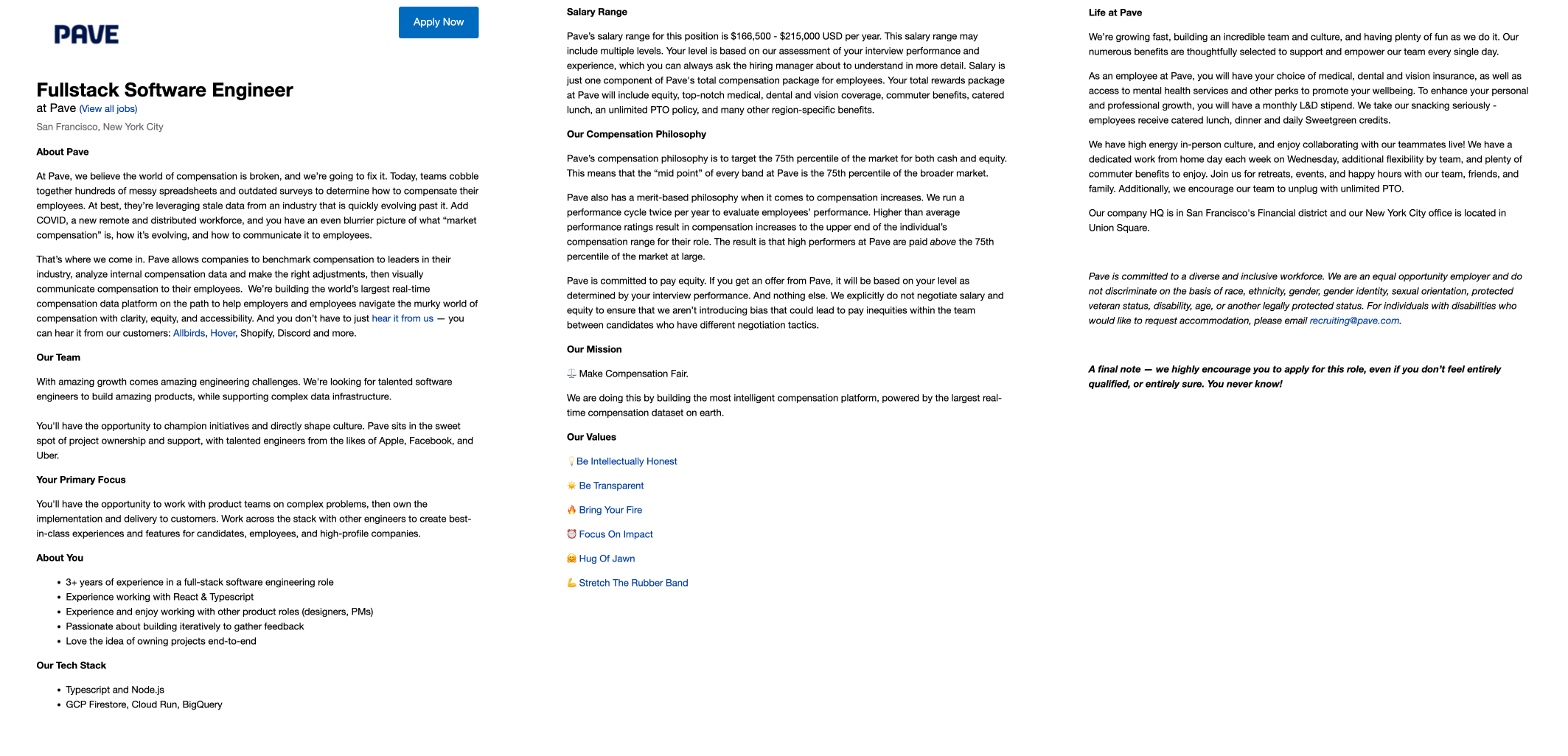 - Les objectifs à atteindre (« Votre objectif principal ») ainsi que l'expérience de travail générale dans l'entreprise (« La vie chez Pave ») sont présents et bien décrits.